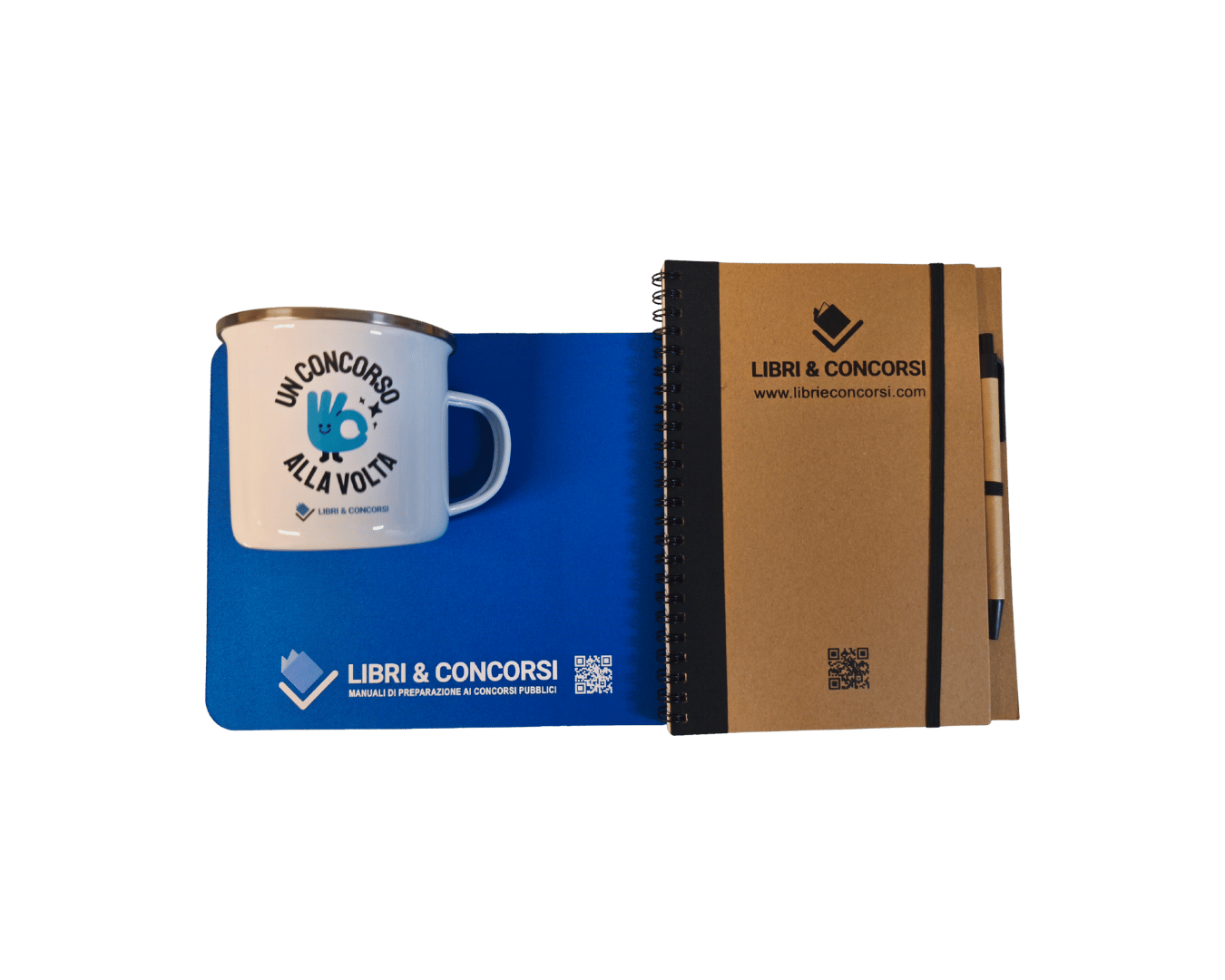 3 accessori ufficiali Libri & Concorsi: tazza in metallo (grafica motivazionale), tappetino mouse (base antiscivolo) e quaderno rigido con penna.