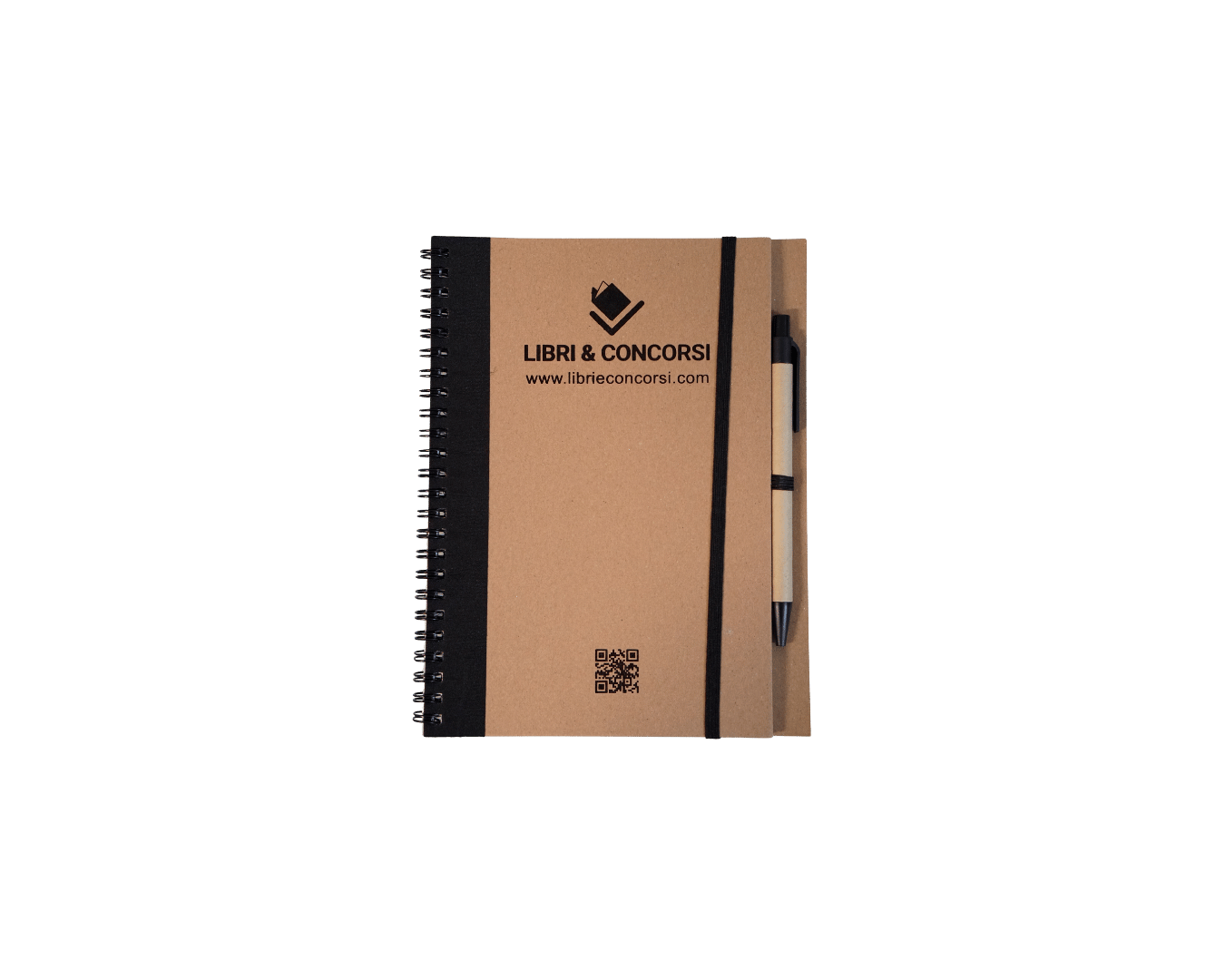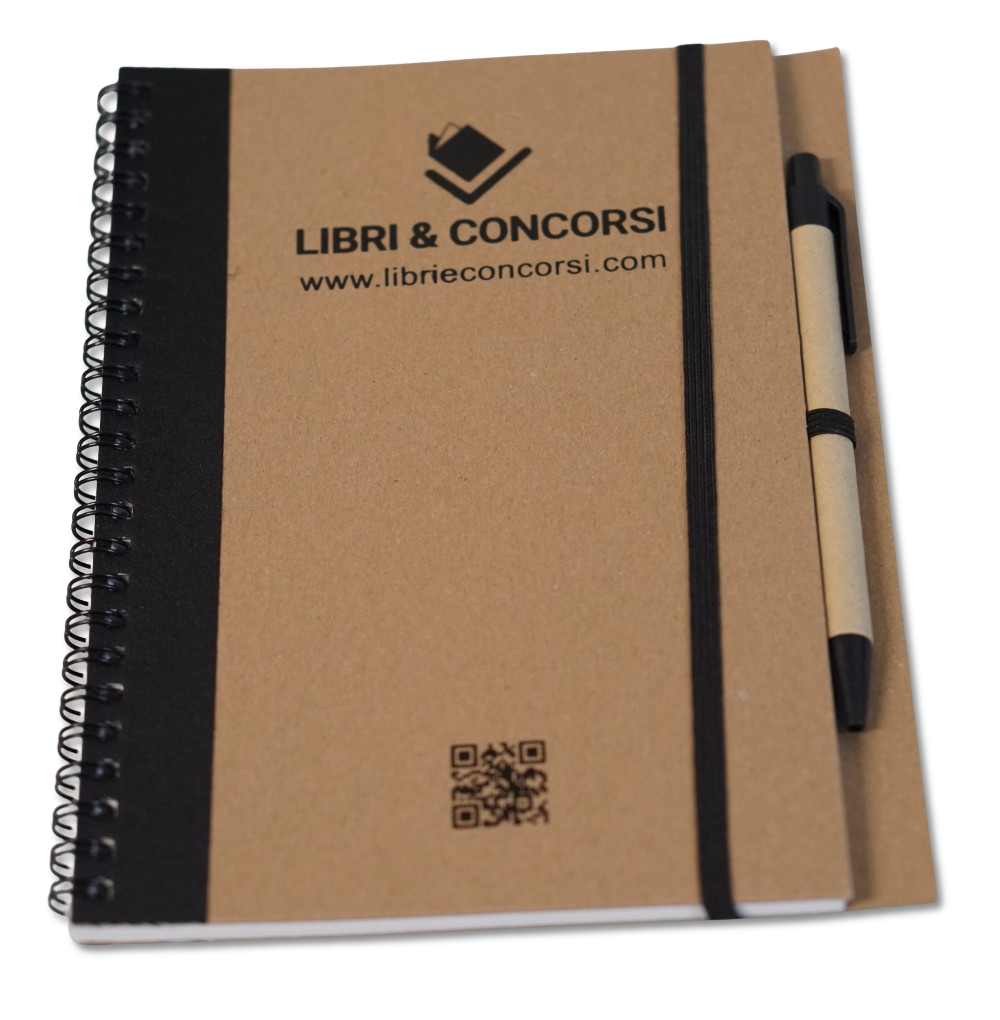📘 Quaderno a spirale con copertina rigida in cartone riciclato, 60 pagine. Penna abbinata (inchiostro blu), logo e QR code Libri & Concorsi.